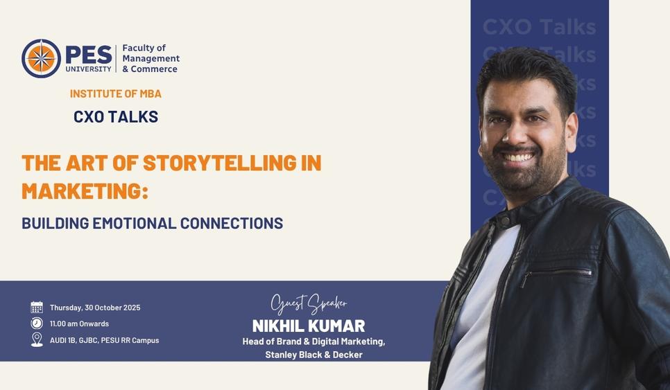The Faculty of Management and Commerce, Institute of MBA, is organising an engaging Masterclass on the October 30, 2025, featuring Mr. Nikhil Kumar, Head of Brand & Digital Marketing, Stanley Black & Decker. He will address the MBA students on the topic: "The Art of Storytelling in Marketing: Building Emotional Connections"