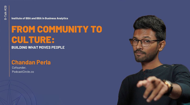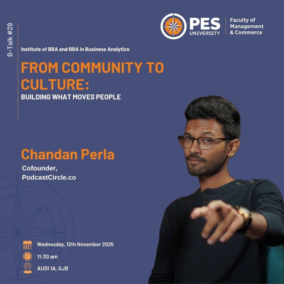 Department of BBA is hosting its 29th B talk series, where Mr. Chandan Perla Co Founder: PodcastCircle.Co will delve into the core strategies on "From Community to Culture: Building what moves people" where students will understand and discover what truly moves people, beyond trends and technology, and how purpose-driven connections create lasting impact.