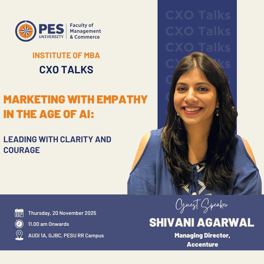 The Faculty of Management and Commerce, Institute of MBA, is organising an engaging Masterclass on the November 20, 2025, featuring Ms. Shivani Agarwal, Managing Director, Accenture. She will address the MBA students on the topic: "Marketing with Empathy in the Age of AI: Leading with Clarity and Courage"