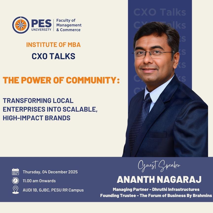 The Faculty of Management and Commerce, Institute of MBA, is organising an engaging Masterclass on the December 4, 2025, featuring Mr. Ananth Nagaraj, Managing Partner - Dhruthi Infrastructures & Founding Trustee - The Forum of Business By Brahmins. He will address the MBA students on the topic: "The Power of Community: Transforming Local Enterprises into Scalable, High-Impact Brands"