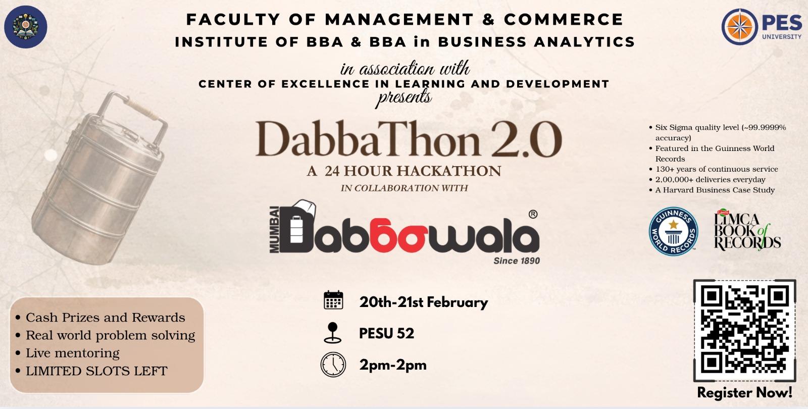 PES University’s Faculty of Management and Commerce invites you to DabbaThon 2.0, a 24-hour immersive hackathon designed to bridge the gap between classroom theory and the grit of real-world operations. This is your chance to contribute high-value solutions to an organization that has been studied by Harvard and admired by royalty.