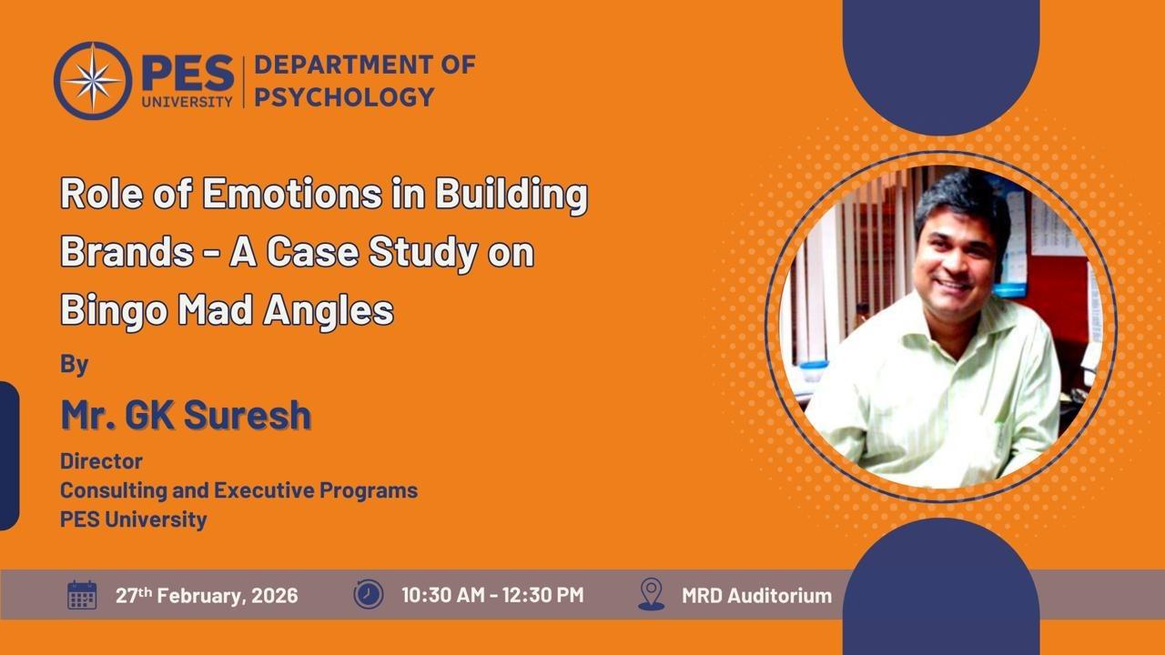 "Role of Emotions in Building Brands – A Case Study on Bingo Mad Angles” by Mr. GK Suresh, Director – Consulting and Executive Programs, PES University, scheduled on February 27, 2026 from 10:30 AM to 12:30 PM at MRD Auditorium.