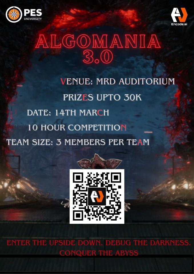 Organized by EncodeAI, PES University, Algomania 3.0 is an inter-college, team-based competitive programming event designed to test real interview-level problem solving.