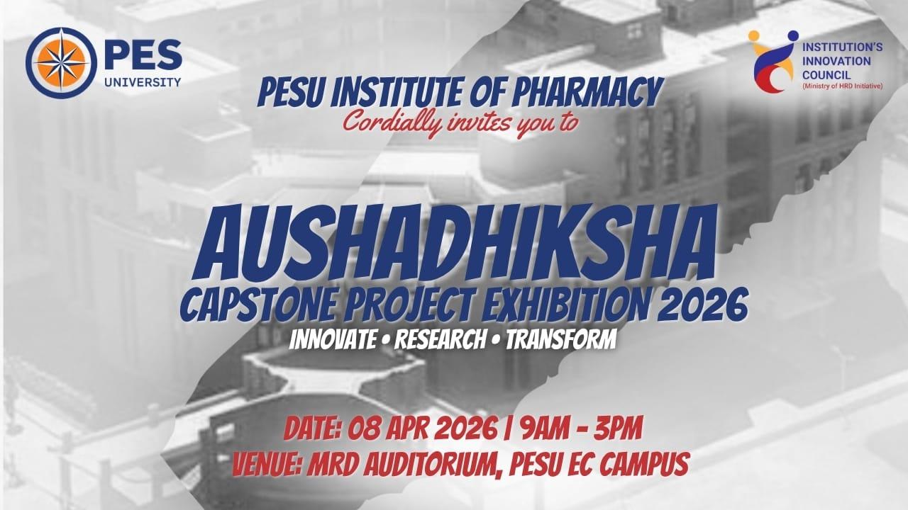 PESU Institute of Pharmacy invites students, academicians, industry professionals, and the public to “Aushadhiksha – Capstone Project Exhibition 2026”, showcasing innovative projects from B.Pharm, M.Pharm, and Pharm.D programs. The exhibition highlights cutting-edge research in drug delivery, formulation development, clinical pharmacy, and pharmaceutical technology. Join us to witness how young researchers are transforming ideas into impactful healthcare solutions.