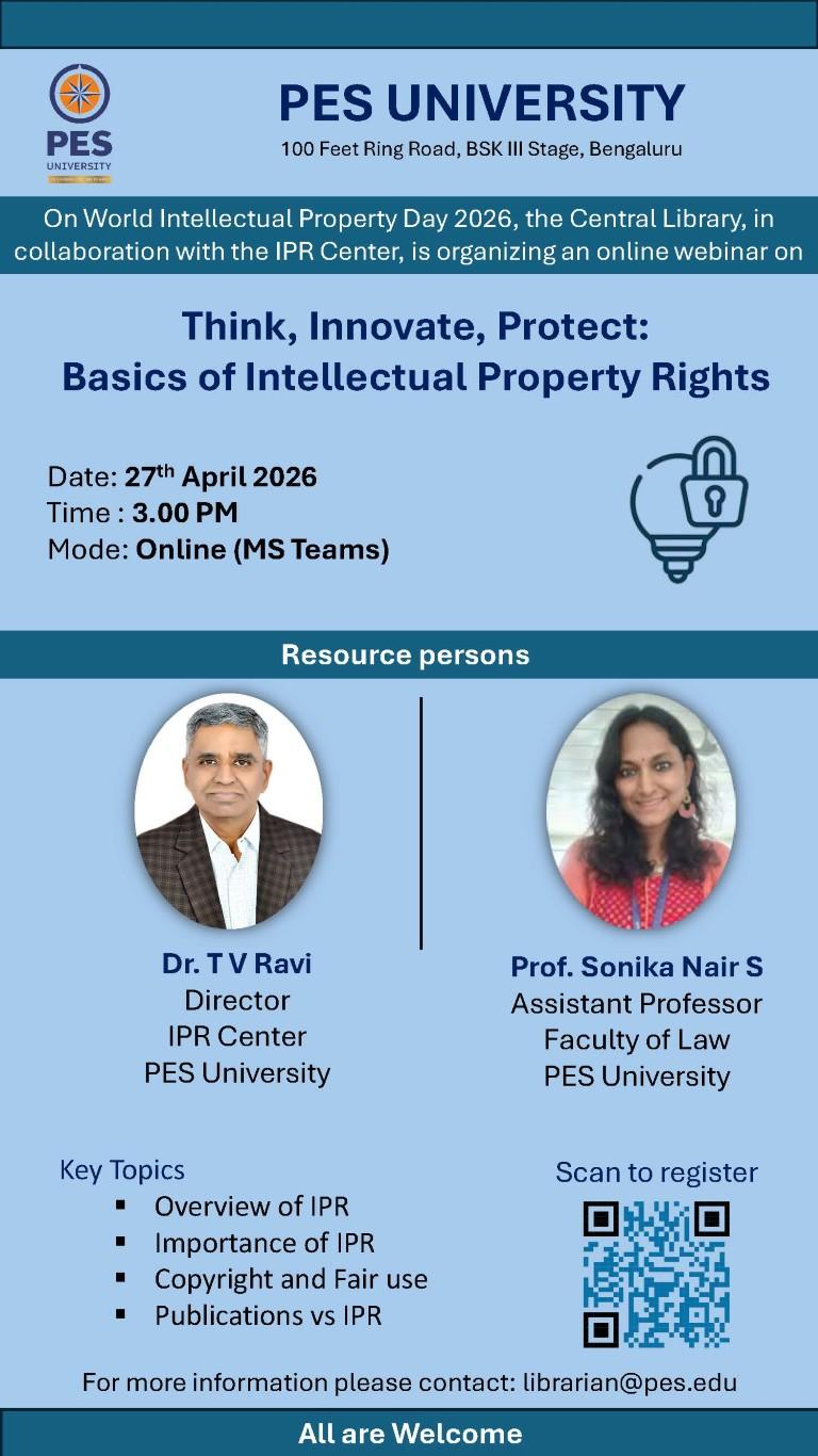 On the occasion of World Intellectual Property Day 2026, the Central Library, in collaboration with the IPR Center, PES University, cordially invites you to participate in an online webinar on “Think, Innovate, Protect: Basics of Intellectual Property Rights”