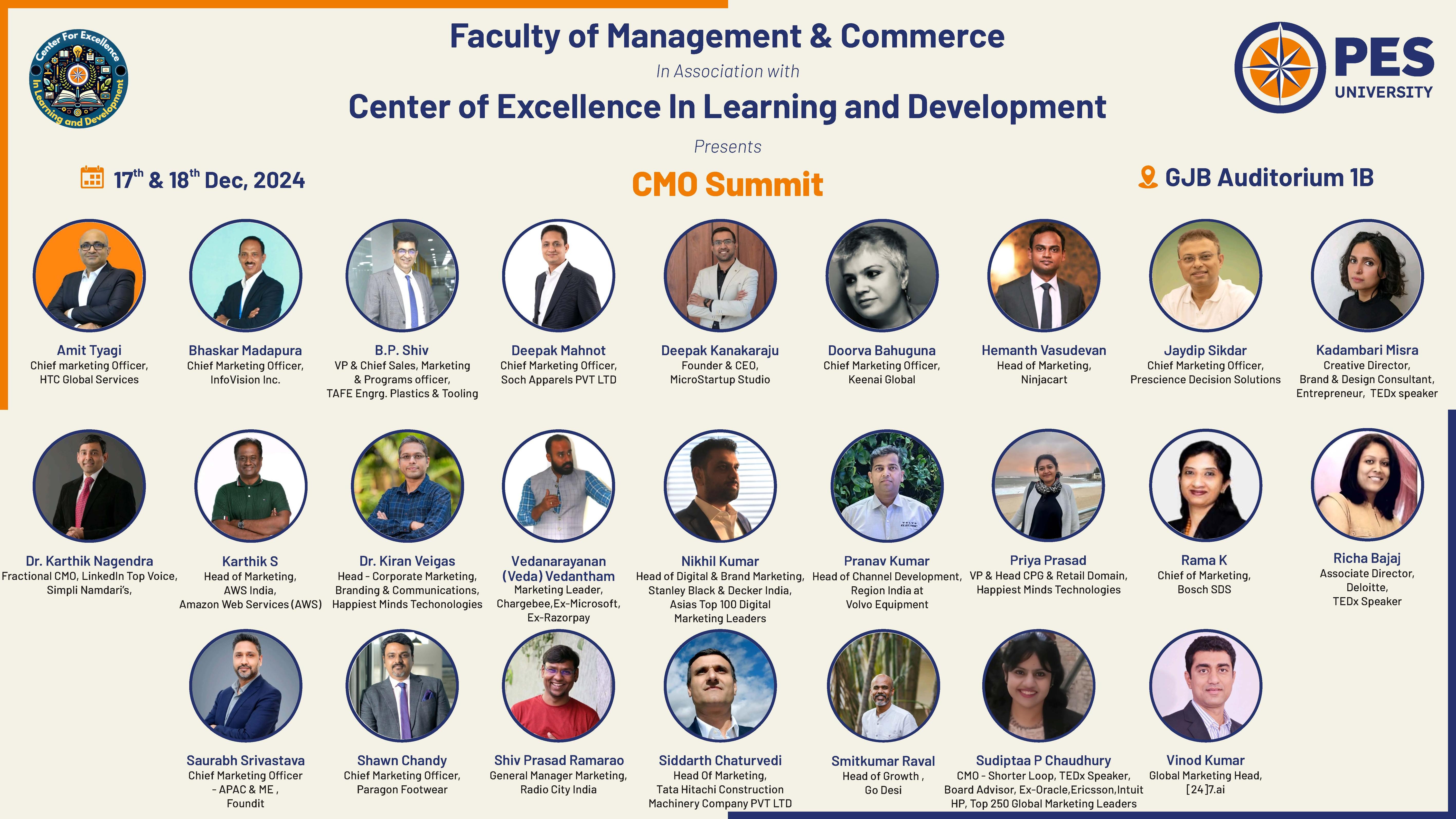Faculty of Management and Commerce, PES University in association with Centre of Learning and Development is organizing CMO Summit with the theme "Marketing in the Age of Disruption – Mastering the 4Ps" on December 17 & 18 2024. It seeks to facilitate interaction among Marketing and Brand leaders, Chief Marketing Officers, Academicians, Career guides and students. The target audience is 500+ students, Faculty members and Eminent Industry Leaders.