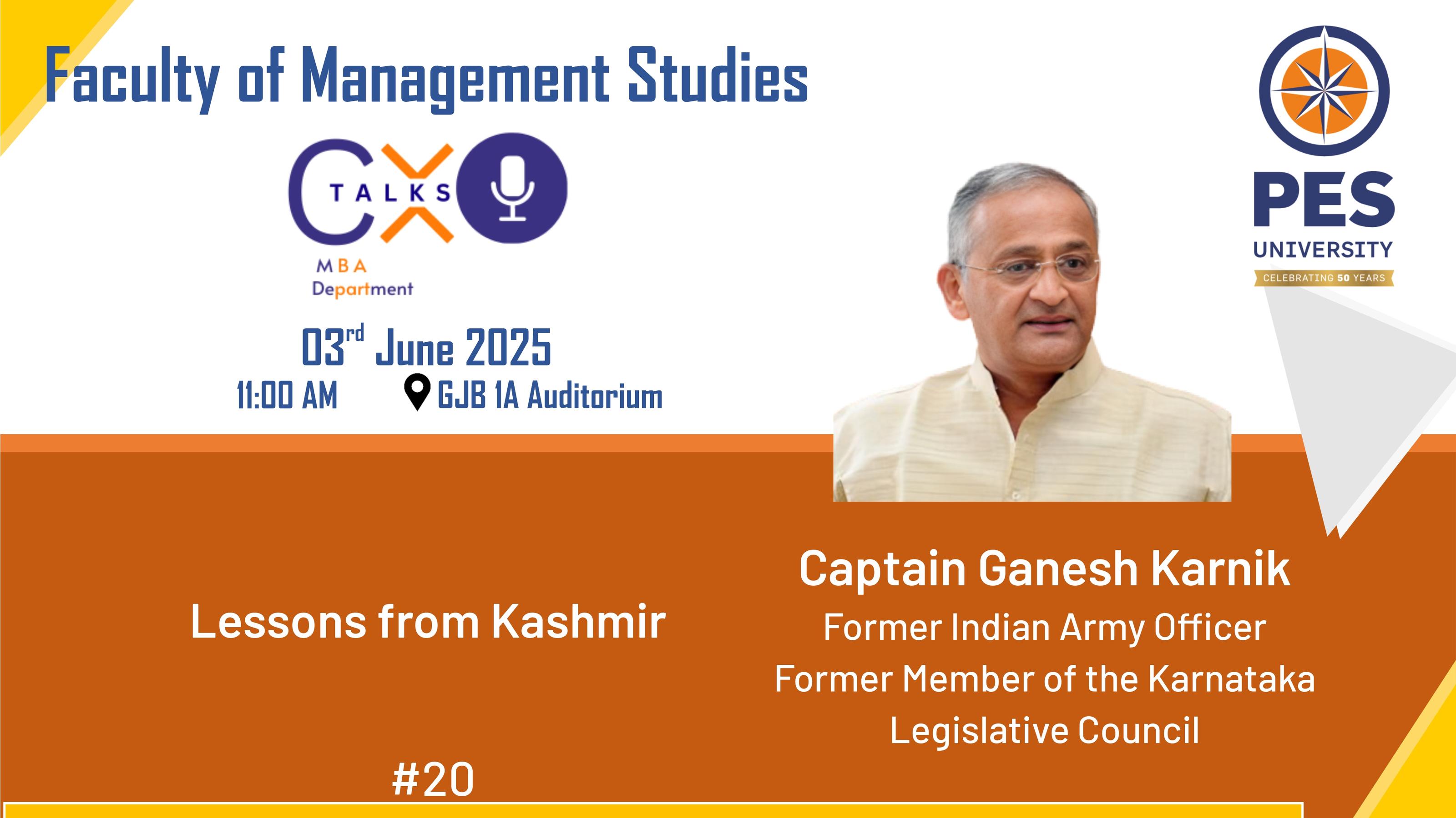 The Faculty of Management and Commerce, Department of MBA, is organising an engaging CXO Talk on June 3, 2025, featuring Captain Ganesh Karnik - Former Indian Army Officer & Former Member of the Karnataka Legislative Council. He will address the MBA students on the topic: "Lessons from Kashmir"