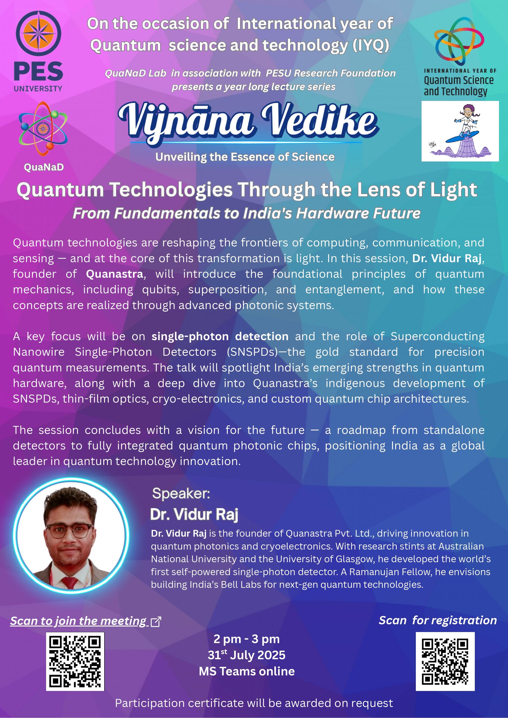 Quantum technologies are reshaping the frontiers of computing, communication, and sensing — and at the core of this transformation is light. In this session, Dr. Vidur Raj, founder of Quanastra, will introduce the foundational principles of quantum mechanics, including qubits, superposition, and entanglement, and how these concepts are realized through advanced photonic systems.