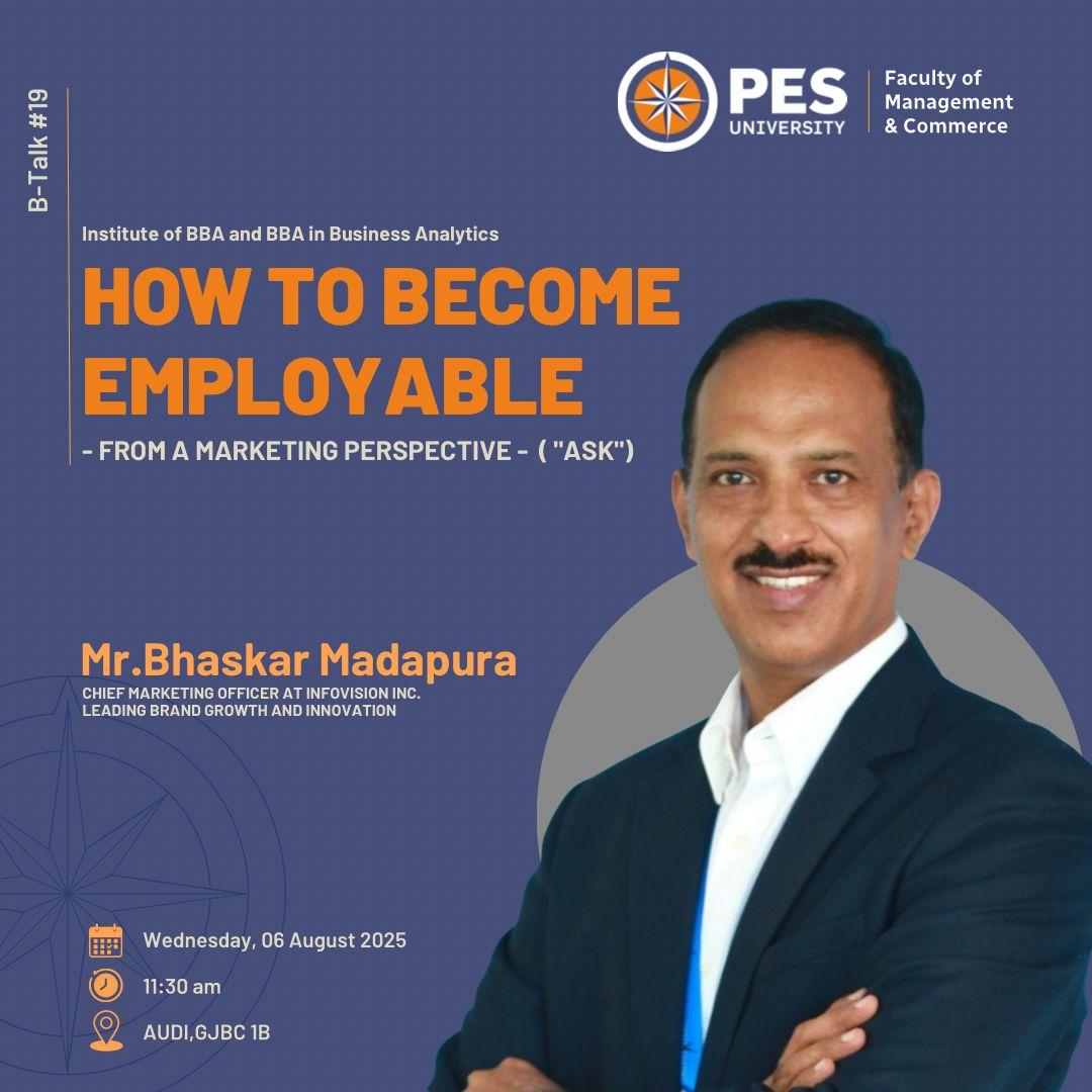 Mr. Bhaskar Madapura, Chief Marketing Officer at InfoVision Inc., Leading Brand Growth and Innovation will delve into the core principles on "How to Become Employable: From a Marketing Perspective." This interactive session will provide students with valuable insights into the evolving expectations of the marketing industry, the essential skills needed to stand out, and strategies to build a strong personal brand.