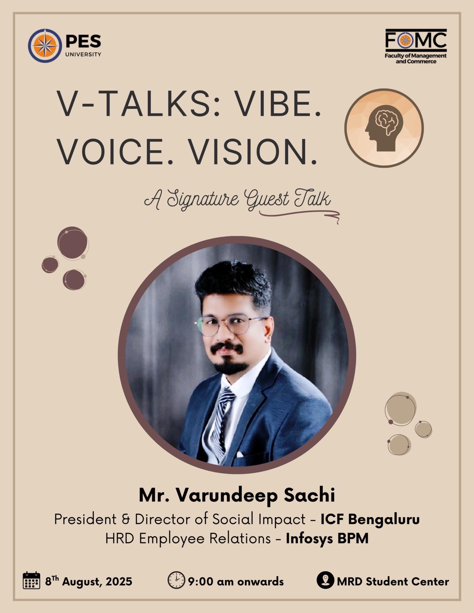 The Faculty of Management and Commerce (FOMC), PES University, is proud to host a powerful edition of V-Talks, a signature guest talk series that brings together compelling minds to inspire, ignite, and influence.