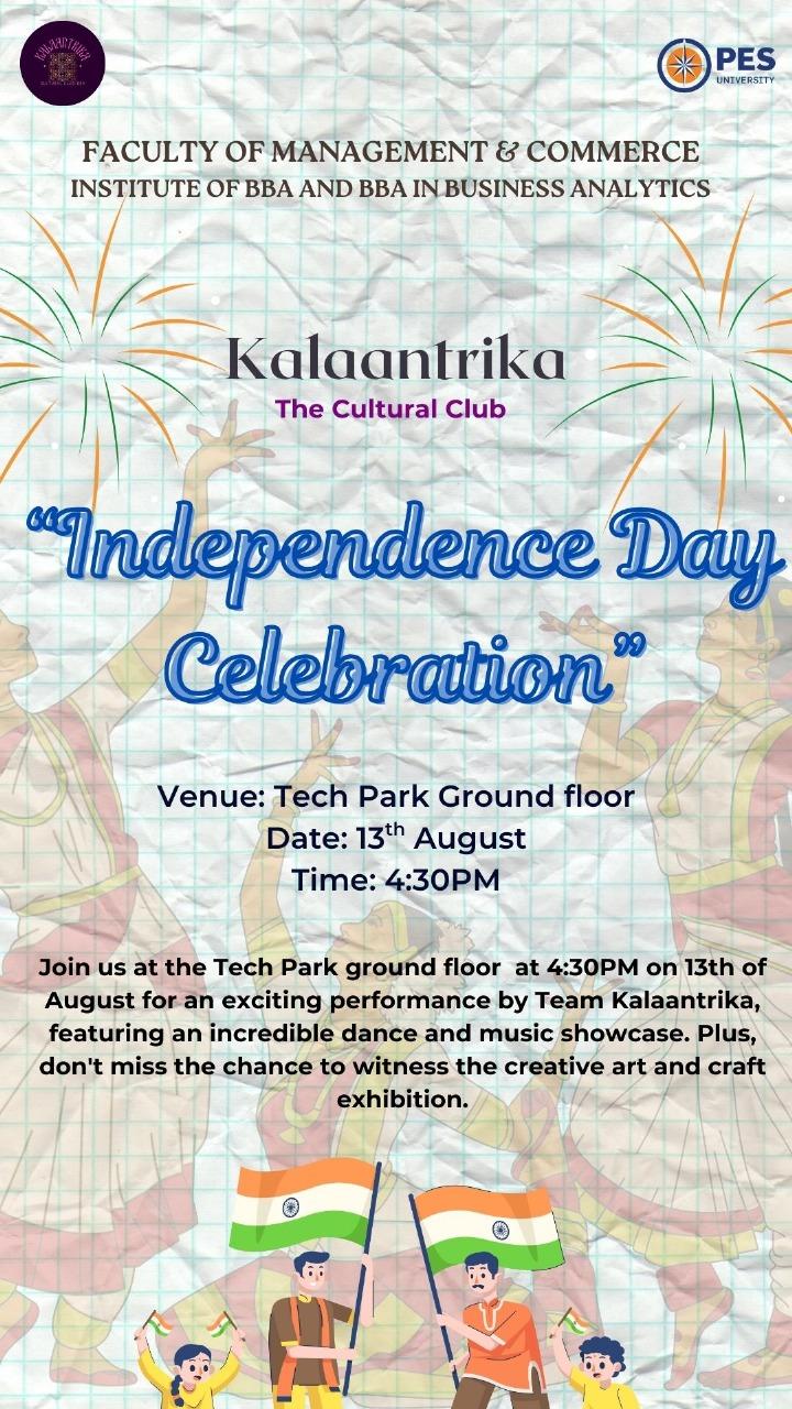 Kalaantrika - The Cultural Club – Institute off BBA invites you to join us for a grand celebration of Independence Day. Get ready for an exciting evening featuring spectacular dance and music performances by Team Kalaantrika