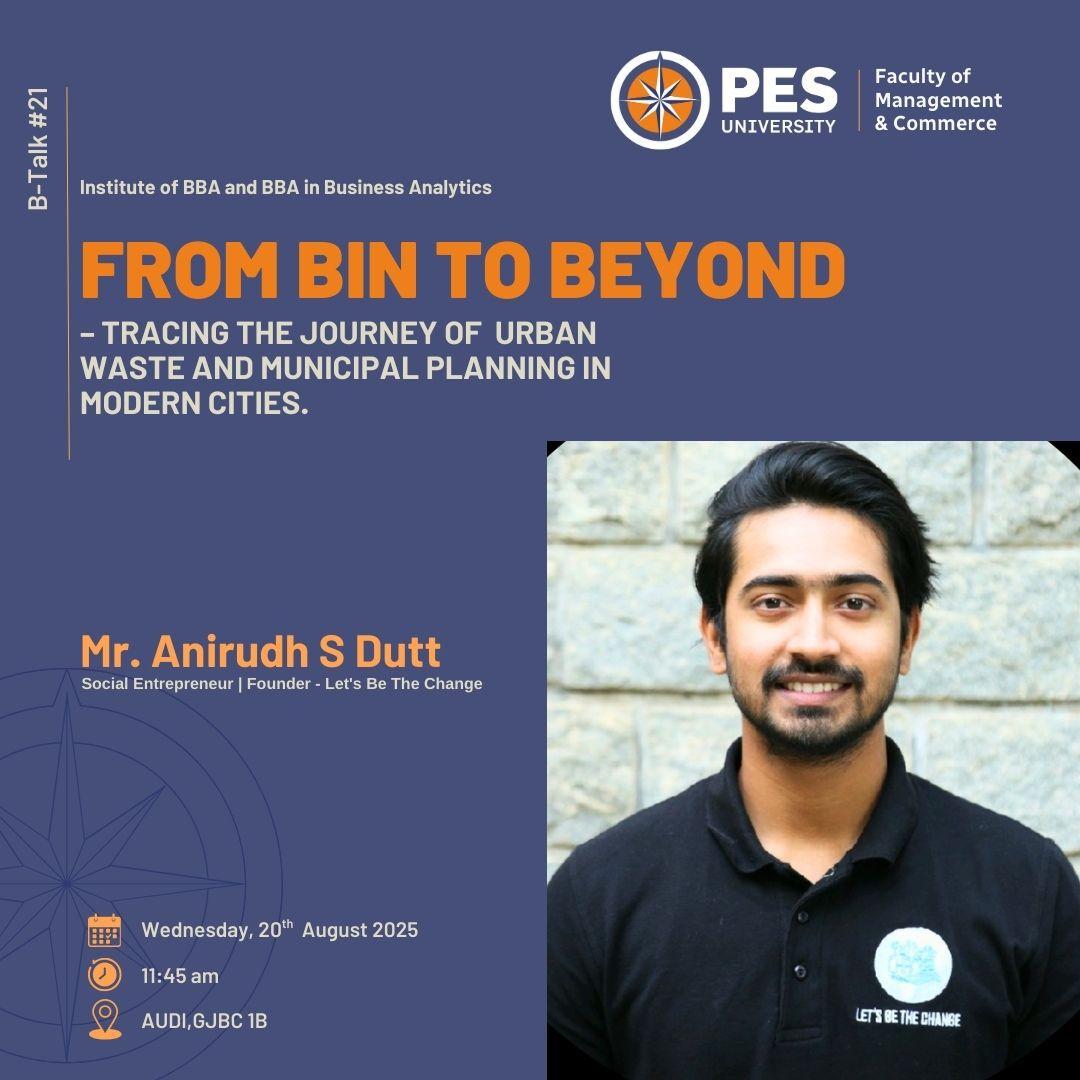 Mr. Anirudh S Dutt, Social Entrepreneur, Founder, Let's be the Change will give students an insight into “From Bin to Beyond – Tracing the Journey of Urban Waste and Municipal Planning in Modern Cities”