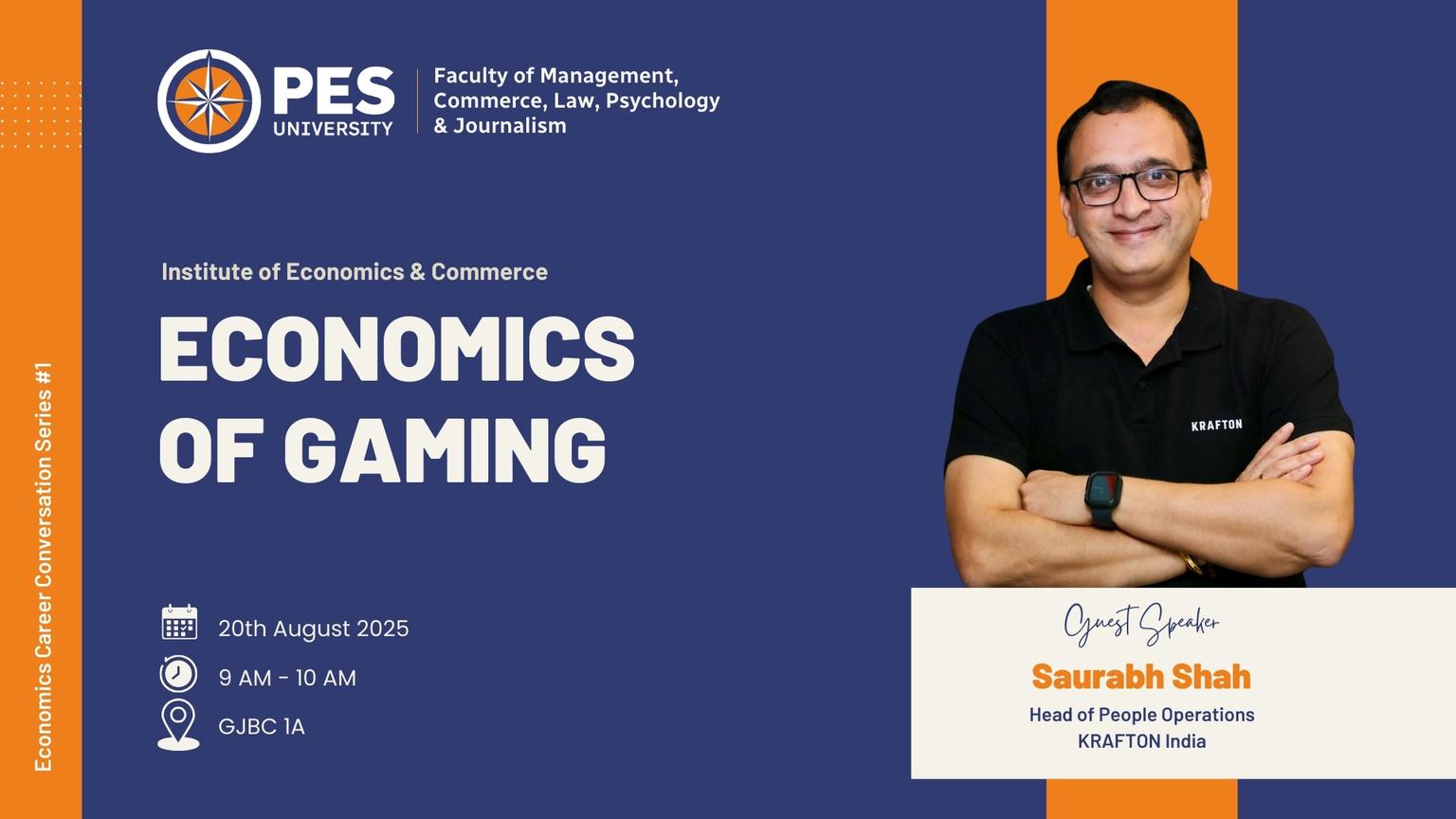 The Institute of Economics is organizing the Economics Career Conversation Series#1, on the August 20, 2025. Where Saurabh Shah, Leader Peoples Op, KRAFTON will be addressing the students on "Economics of Gaming" at GJBC 1A.
