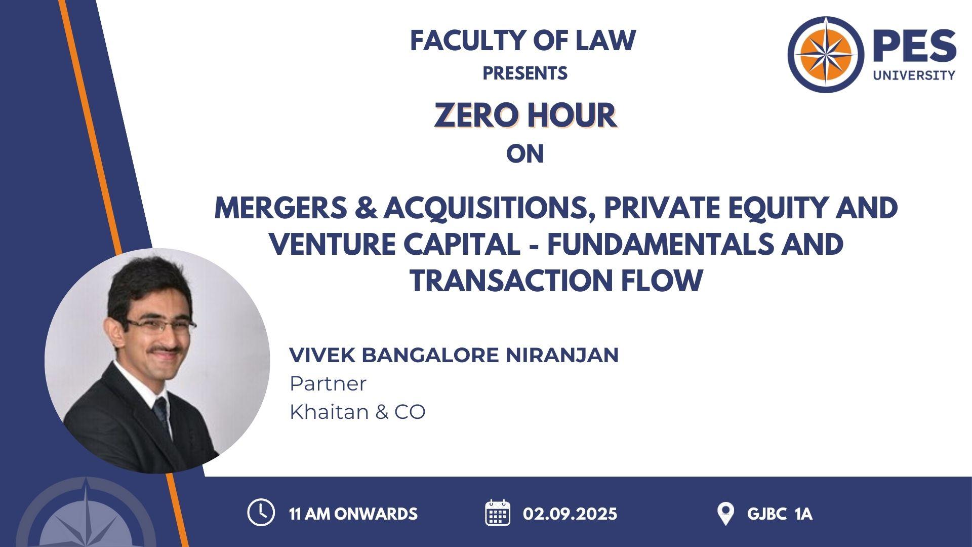 The Faculty of Law is organising a Zero Hour on 'Merger & Acquisition, Private Equity and Venture Capital - Fundamentals and Transaction flow' by Vivek B Niranjan, on September 2, 2025.