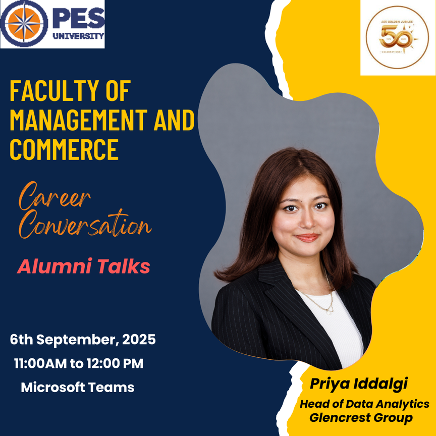 Faculty of Management and Commerce, PES University is excited to host our upcoming Career Conversation Session with our esteemed alumni, Ms. Priya Iddalgi (2016 -20, Bachelor of Engineering, Electronics and Communications Engineering ) and a Masters from University of California. Ms. Iddalgi had an exceptional journey at our University, currently the Head of Data Analytics in Glencrest Group, San Francisco, California. Ms. Priya has graciously agreed to share her insights, experiences, and advice.