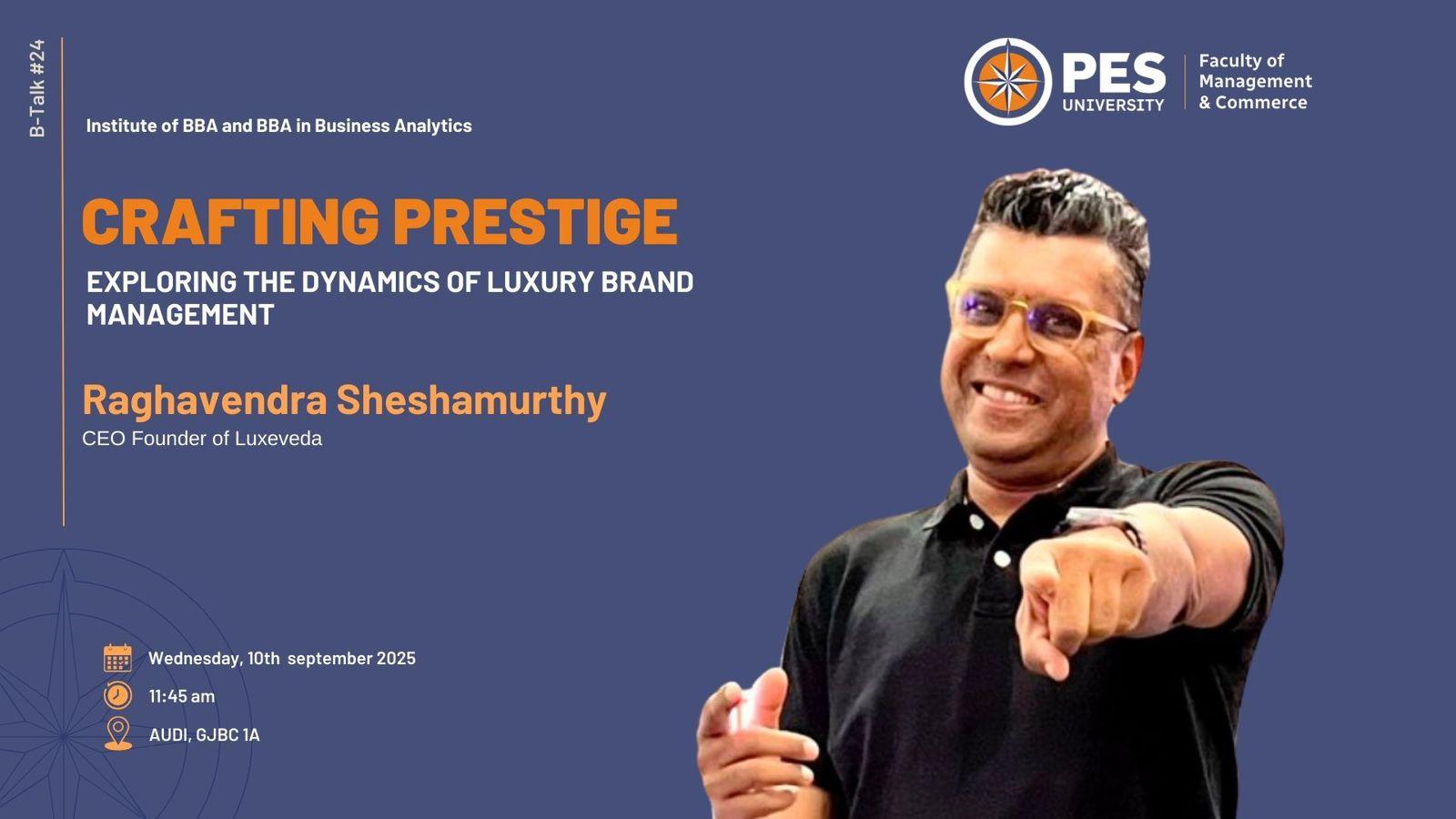 Institute of BBA and BBA(Business Analytics) will host the next B talk series on "Exploring the dynamics of Luxury Brand Management" by Raghavendra Sheshamurthy, (CEO and Founder of Luxaveda)