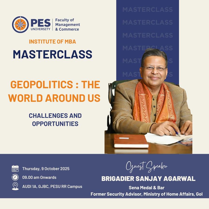 The Faculty of Management and Commerce, Institute of MBA, is organising an engaging Masterclass on the October 9, 2025, featuring Brigadier Sanjay Agarwal, Sena Medal & Bar, Former Security Advisor, Ministry of Home Affairs, Gol. He will address the MBA students on the topic: "Geopolitics: The World Around Us - Challenges and Opportunities"